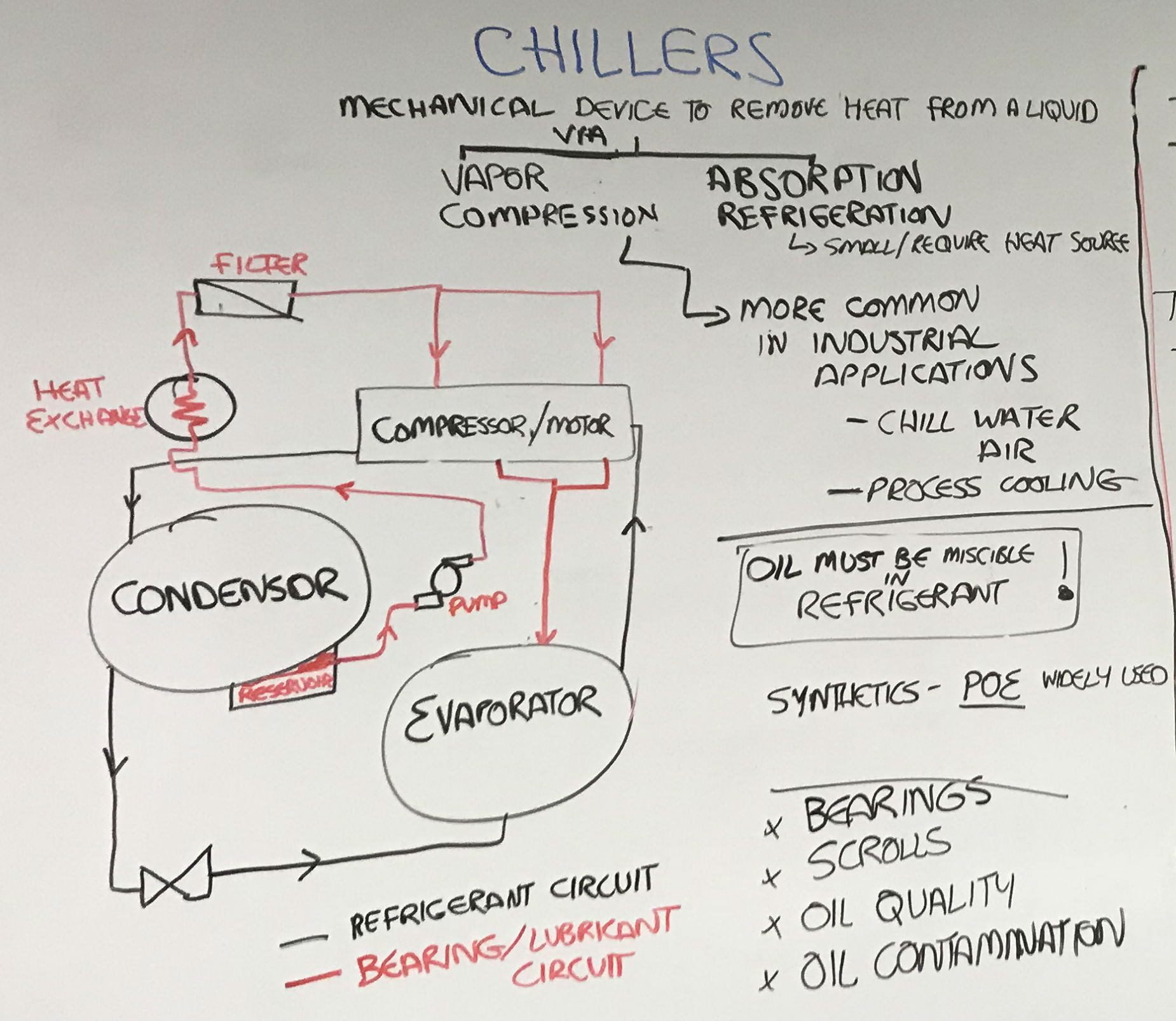 These systems are typically sealed so refrigerant can't escape. For this reason it's logical to ask, why do I need oil analysis on a sealed system? The short answer is yes. The fluids in these systems still need to be moved around and compressed by pumps and scrolls. What we need to monitor is the condition of the bearings and other moving parts in the components that drive these systems. Specifically we are interested in monitoring the bearings, the scrolls, oil quality and oil contamination.
