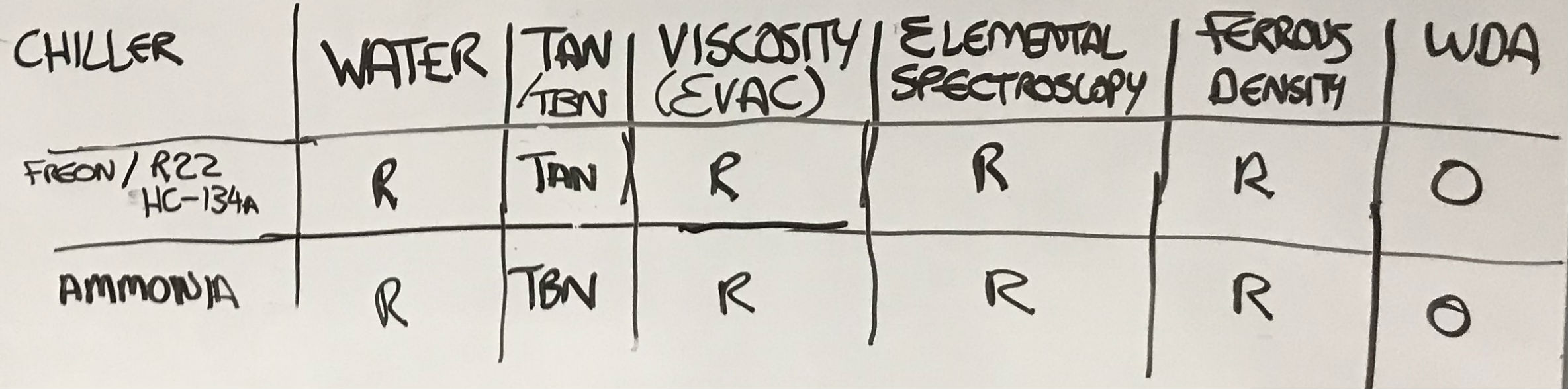 Acidity/basicity - for chlorinated refrigerants like Freon or R-22, we recommend running a test for Total Acid Number (TAN). For ammonia-based systems we recommend running a test for Total Base Number (TBN). TAN can affect the miscibility of the lubricant in the refrigerant.