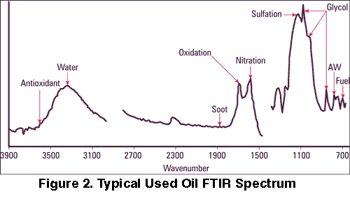 Infrared Spectroscopy is a great technique for detecting organic contaminants, water, and oil degradation products in a used oil sample. One measurement gives a wealth of information about the oil condition and contamination.