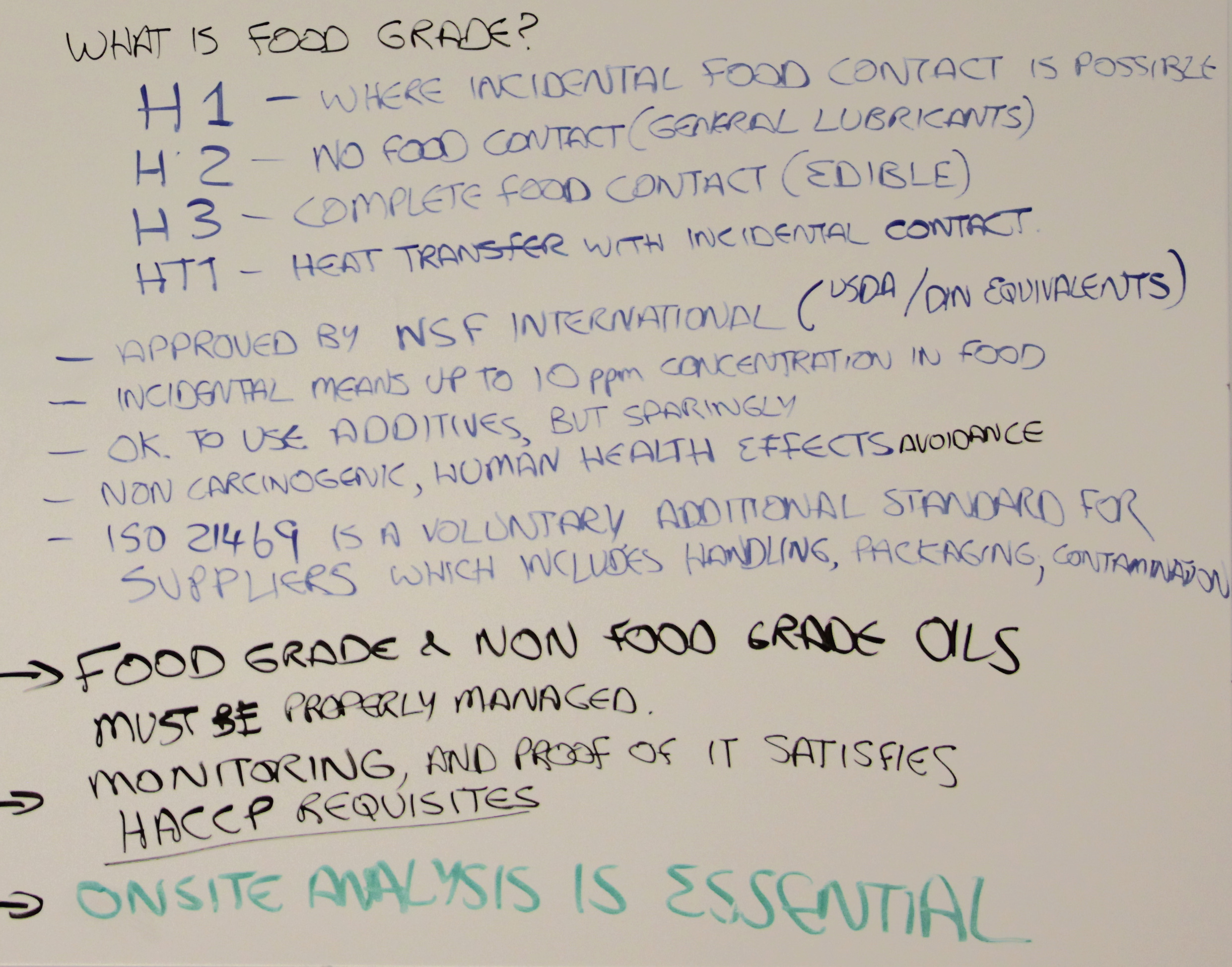 In many sites, about 80 percent of the plants often operate with grease bearings on bearings, conveyor belt drives, and slide systems. The relevant tests are for water content, ferrous density, oxidation, and additives. Those indicate whether it is a food grade product or not. The concern is wear and wash down effects in those cases.