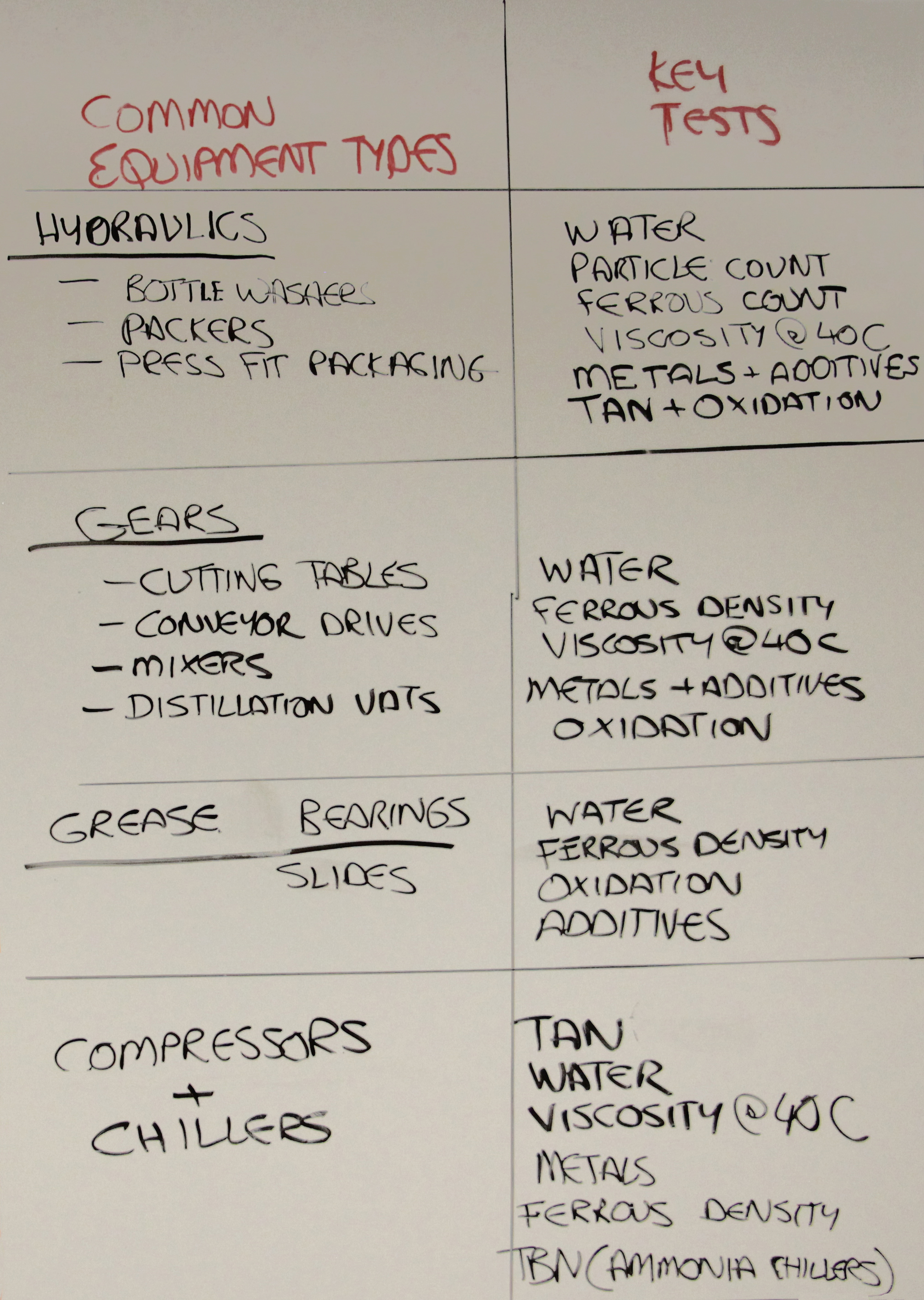 The typical type of equipment are hydraulic systems, gears, grease systems, compressors, and chiller systems. These are the most common types of rotating equipment in these facilities. In the case of hydraulic systems, they're using a lot of different applications, such as bottle washers, packers, and press fit packaging systems. The key tests are water content, particle count, ferrous particle count, viscosity, metals and additives, as well as tan and oxidation. The reason is because it is critical to make sure that the right oil is present in the equipment. If there are food grade oils and the wrong oil gets placed there, that's a high risk to the to the process in the form of contamination. Wear is also a concern because if there's any wear at all, it is important to know when to actually schedule the replacement of that system.