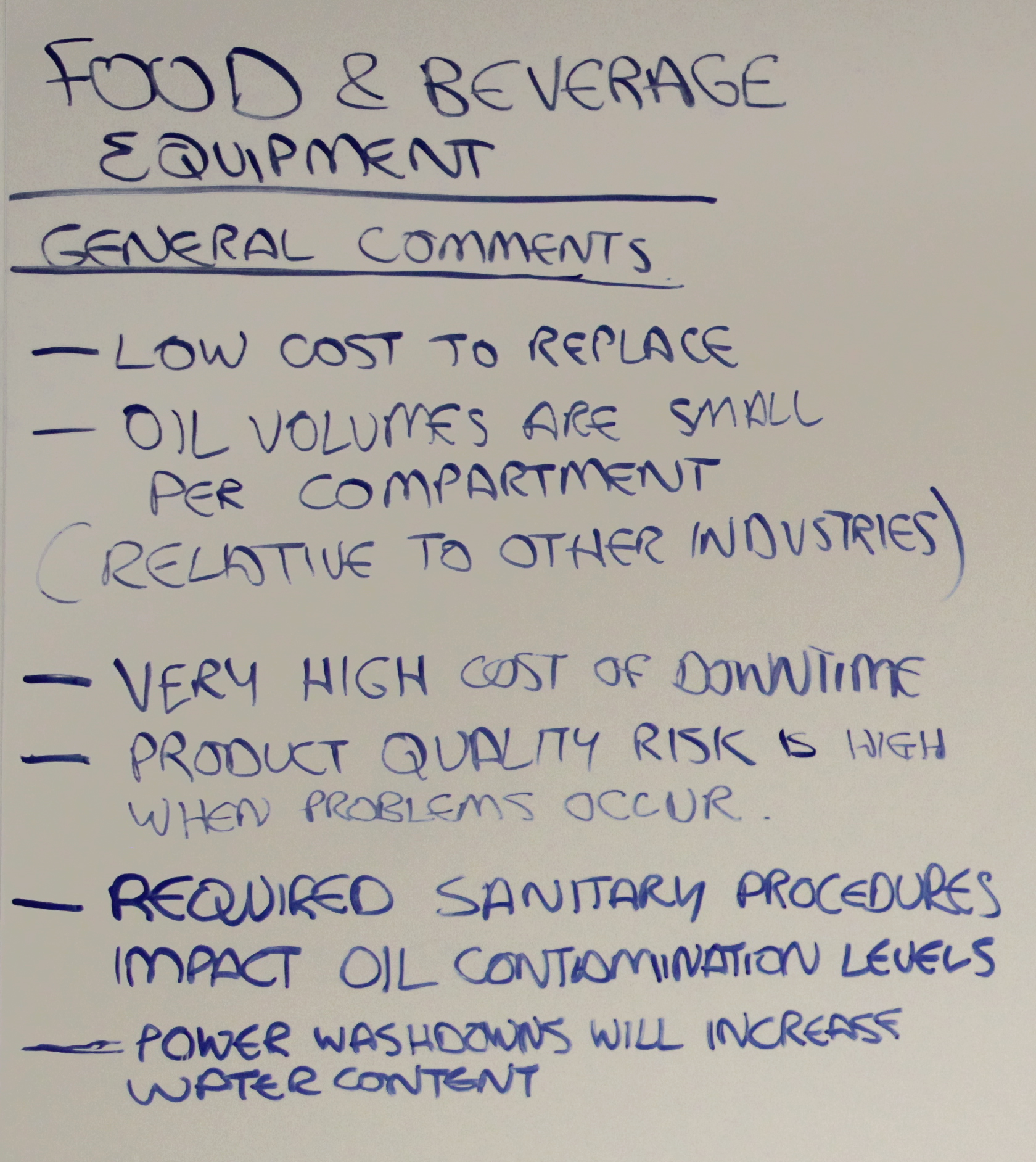 The actual equipment that's often used in these processing facilities tends to be much lower value than what we might see in other industries on a per component basis. As a result, it's very low cost to replace the actual equipment, if needed. Volumes are small (not as much volume as you would see in mining or power generation); however, food-grade lubricants are priced at a premium so additional cost is incurred. What's interesting is it's a very high cost of downtime, so even though you have a very small, inexpensive, gearbox or conveyor belt bearing, the cost of downtime is a concern when that small component fails. The product quality risk also is high if there are contamination issues. Anytime contamination gets into the system as a result of the oil, it poses a risk. Another issue is the additional required sanitary operating procedures, such as pressure wash downs, required on a regular basis. That can impact oil contamination because water can slip by into the seals. As a result, monitoring is necessary on a frequent basis.