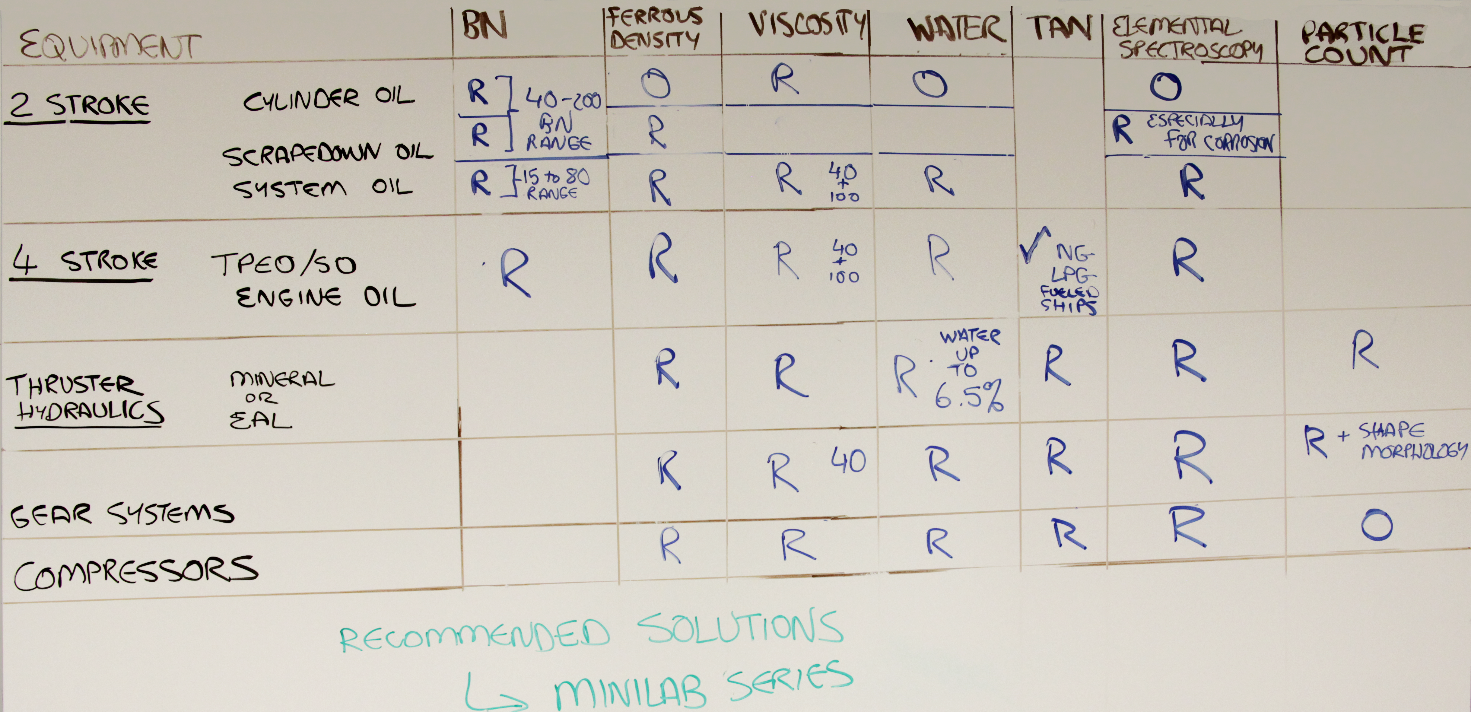 In the case of regular four-stroke engine oil, base number, ferrous density and viscosity are key tests that are very important. Water content, as well as elemental spectroscopy is also suggested. With the sulfur cap mentioned earlier, there are going to be more engines that are powered by natural gas, or LPG propane based ships. In those situations, there may be more of a requirement for total acid number,which is very similar to land-based natural gas compressors where TAN and TBN are required.
