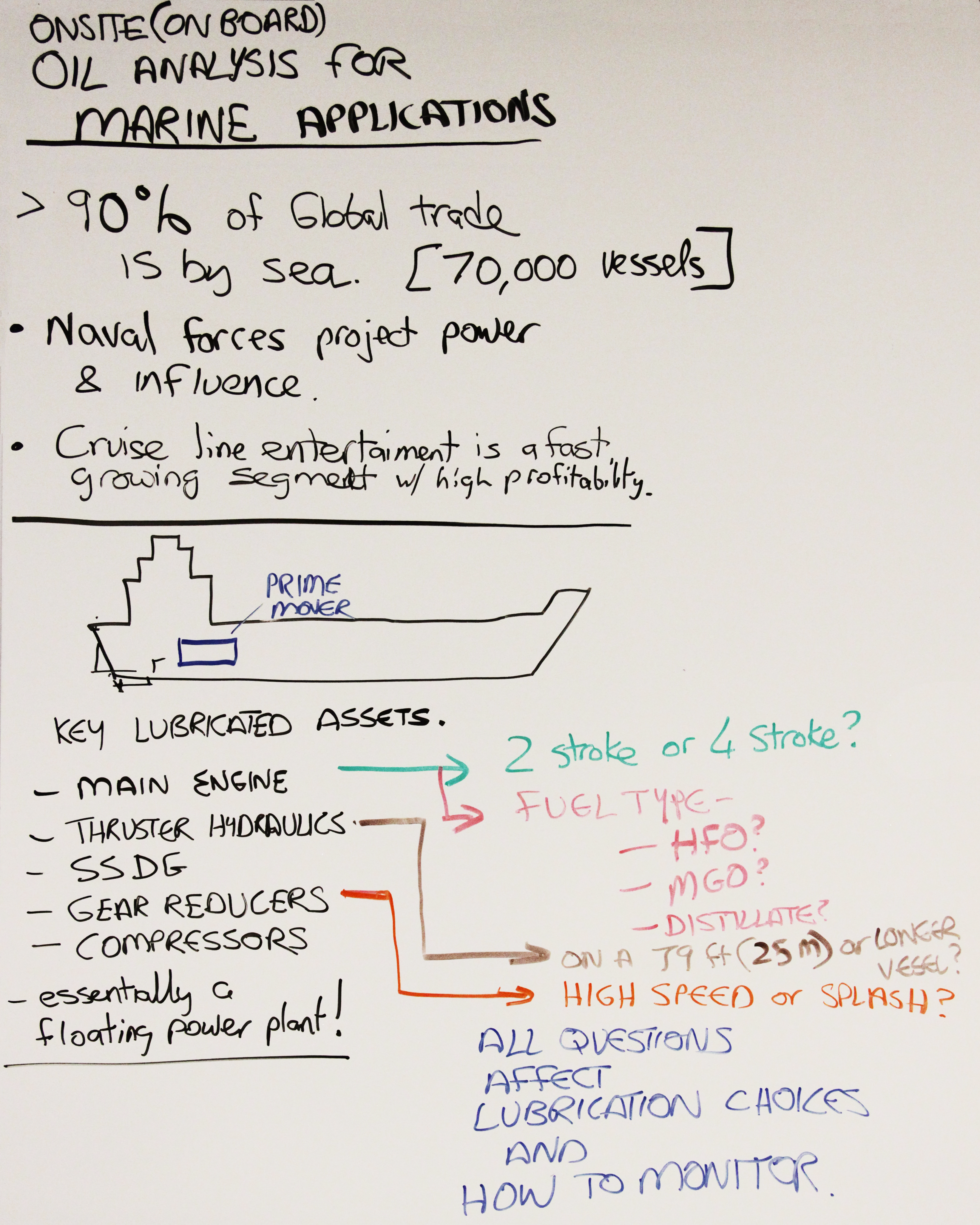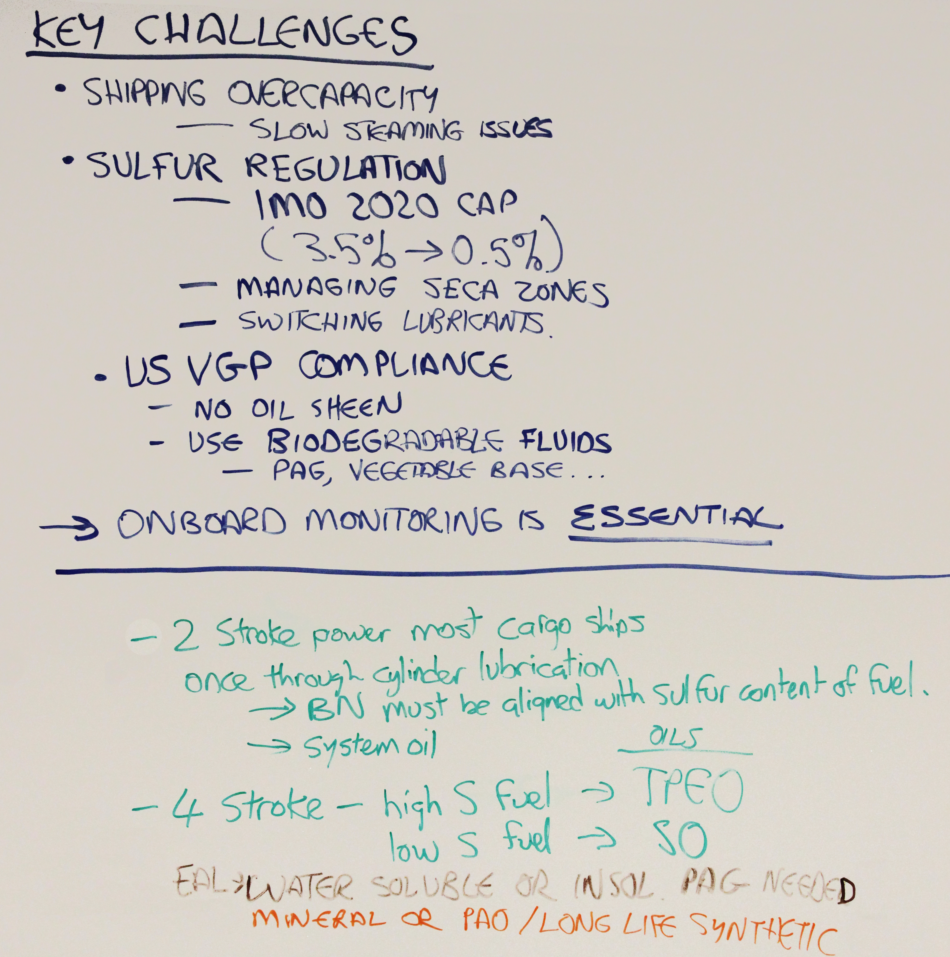 There are three major challenges when it comes to the marine market. The first is an overcapacity in shipping with more vessels out on the seas than goods in supply. Because of that, merchant lines are managing different approaches in order to reduce costs. Some of those approaches have a negative effect on the reliability of the equipment which is why on-site oil analysis is important, particularly when it comes to things like slow steaming issues. The second major issue is the new sulfur regulation that is coming in the near future. In 2020 all the fuels that are typically heavy fuel oils and high sulfur fuels, are changing from 3.5% down to 0.5%. As a result of that requirement, there will be some significant investments made to ensure compliance. There are also a lot of issues surrounding fuel quality assurance. There are already existing sulfur emission control areas around Europe, the US and certain areas in China. Ships now have to switch from high sulfur fuel to low sulfur fuel when they go into port. When that switch occurs it is also important to match the engine lubricant, especially on two-stroke engines, from a high base number to a low base number. Finally, there is the US VGP or Vessel General Permit compliance, issued in 2013 that states any vessel longer than 25 meters or 79 feet must have some compliance where any oils that come in contact with water have to biodegradable; the requirement for rotating equipment to have EAL, environmentally aware lubricants, or biodegradable lubricants is particularly stringent. These major issues affect the industry, and make it more complex than ever before. Today, on board monitoring is essential to navigate through these processes.
