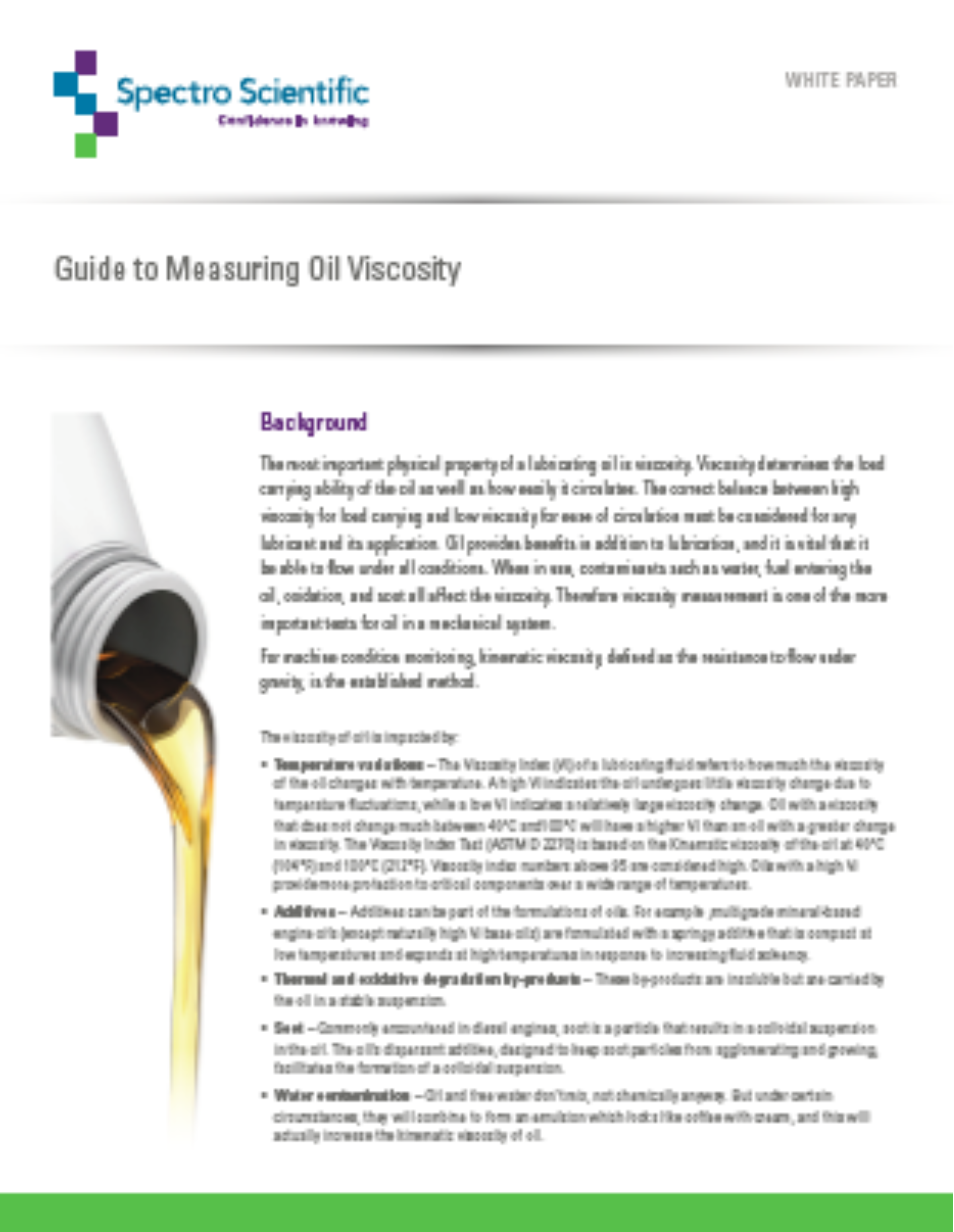 The most important physical property of a lubricating oil is viscosity. It determines the load carrying ability of the oil as well as how easily it circulates. The correct balance between high viscosity for load carrying and low viscosity for ease of circulation must be considered for any lubricant and its application. Oil provides benefits in addition to lubrication, and it is vital that it be able to flow under all conditions. When in use, contaminants such as water, fuel entering the oil, oxidation, and soot all affect the viscosity. Therefore viscosity measurement is one of the more important tests for oil in a mechanical system. For machine condition monitoring, kinematic viscosity, defined as the resistance to flow under gravity, is the established method.