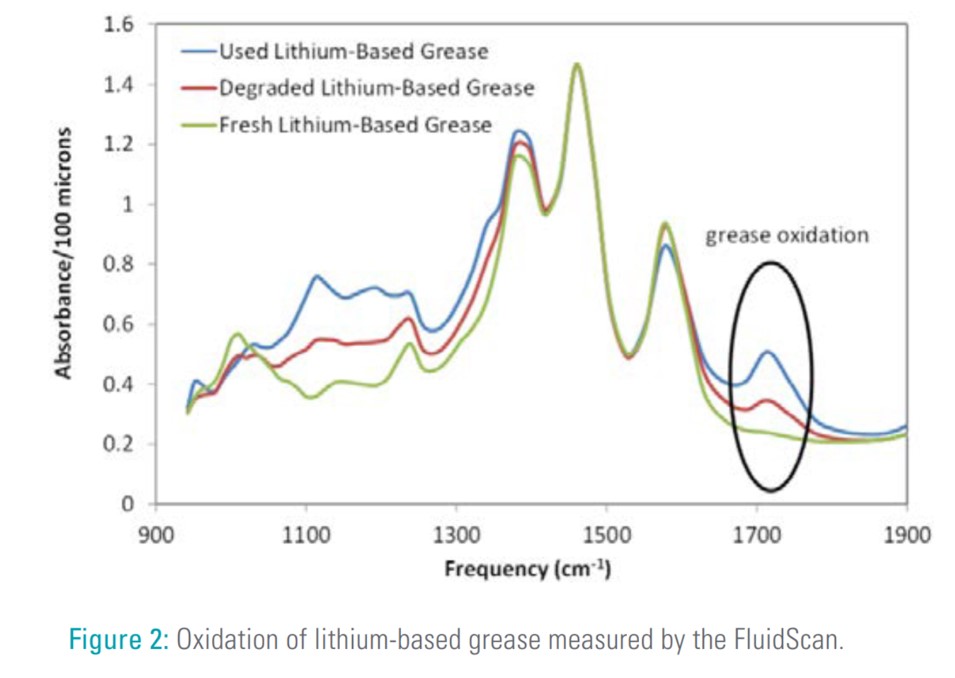 Moisture and oxidation can also be determined on the FluidScan. A typical moisture peak can appear on the IR Spectrum around 3400cm-1. As these greases begin to age and oxidize, the buildup of oxidation products may be monitored by the FluidScan infrared analysis, as illustrated in (Figure 2) for a lithium-based grease. This is translated into an oxidation value and automatically reported to the customer after each analysis. Oxidation warning and alarm limits for the greases have been built into the system.