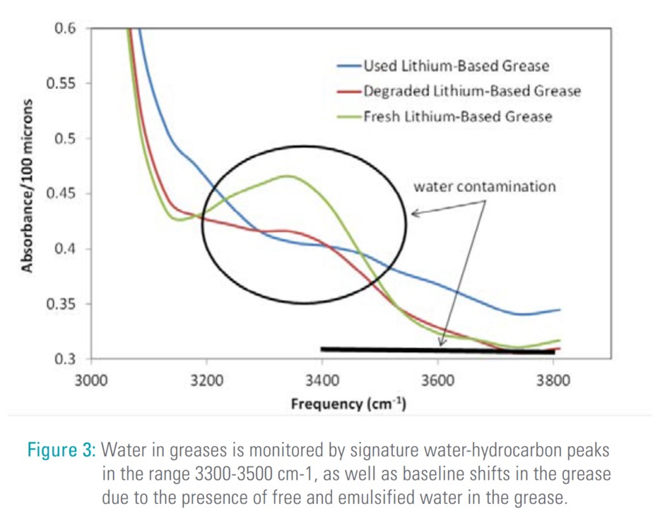 Similarly, although greases are designed to reject water intrusion, water may build up in the grease, signaling issues with the health of the grease. This is also reflected in the infrared spectrum as shown in (Figure 3) Both the baseline of the infrared spectrum as well as the water-hydrocarbon bond are monitored to produce a total water reading for greases.