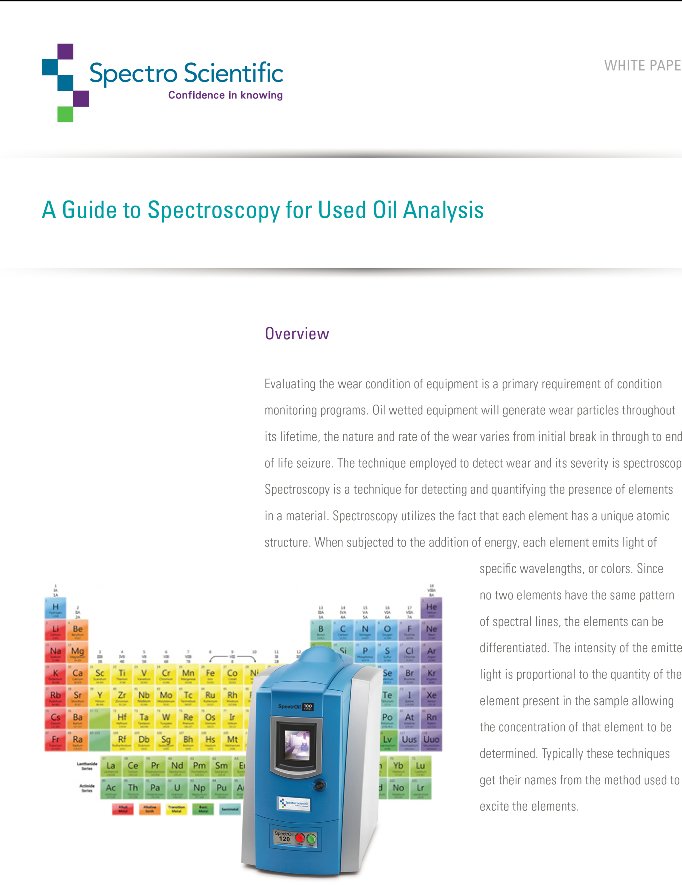 Evaluating the wear condition of equipment is a primary requirement of condition monitoring programs. Oil wetted equipment will generate wear particles throughout its lifetime, the nature and rate of the wear varies from initial break in through to end of life seizure. The technique employed to detect wear and its severity is spectroscopy. Spectroscopy is a technique for detecting and quantifying the presence of elements in a material. Spectroscopy utilizes the fact that each element has a unique atomic structure. When subjected to the addition of energy, each element emits light of specific wavelengths, or colors. Since no two elements have the same pattern of spectral lines, the elements can be differentiated. The intensity of the emitted light is proportional to the quantity of the element present in the sample allowing the concentration of that element to be determined. Typically these techniques get their names from the method used to excite the elements.