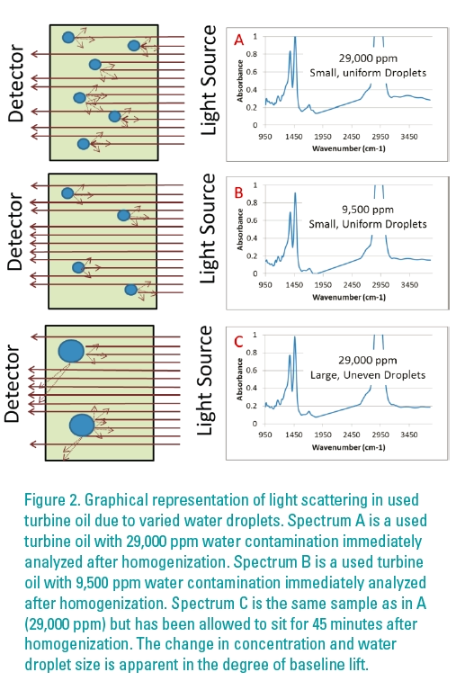 A new water calibration that measures light scattering due to the presence of water droplets is available on the FluidScan for the Industrial Library. The method was developed with water contaminated samples of several popular brands of turbine and gear/bearing oils for a robust universal calibration of industrial fluids ranging from a few hundred ppm up to 65,000 ppm water.