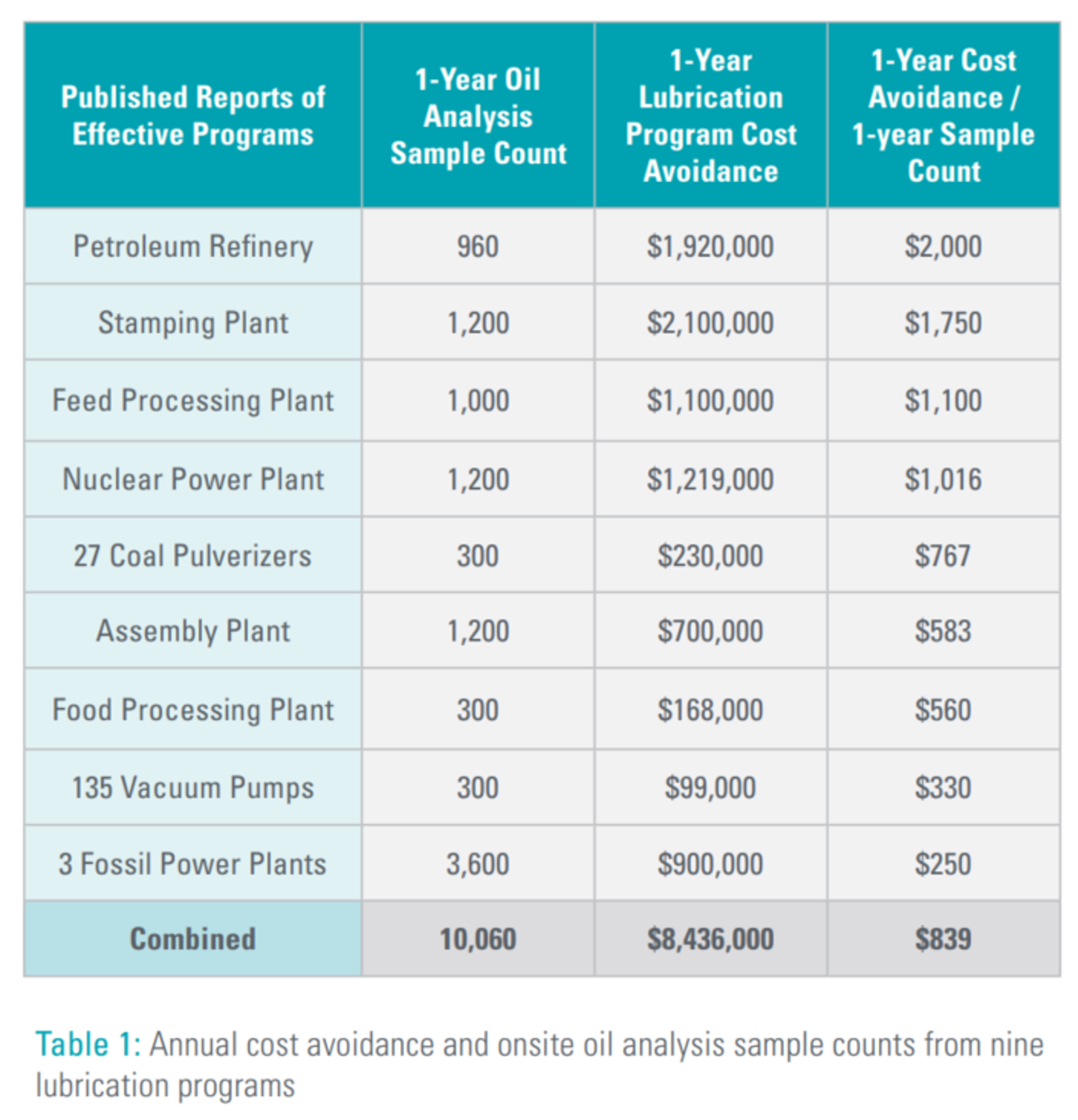 Combined one-year sample count for all nine lubrication programs is 10,060 samples tested with onsite oil analysis. Combined lubrication programs cost savings was $8,436,000. On average, the effective lubrication programs saved $839.00 for every sample tested.