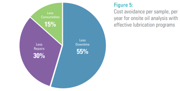 The pie chart in Figure 5, proportions this overall cost savings per sample per year as follows: 55% from less downtime, 30% from less repairs and 15% from less consumables.