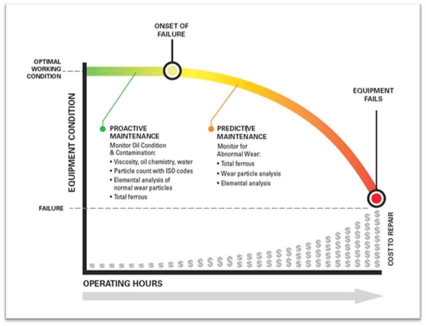 Figure 1 shows a typical machine failure curve. The figure clearly depicts that oil analysis testing like viscosity, elemental and particle count are useful parameters to trend even when equipment condition is considered satisfactory. Any issues detected would still be early enough in the failure process to perform the necessary maintenance in plenty of time before a failure. This keeps the cost of repairs relatively low. As the machine failure progresses, the detection of abnormal wear can be detected and still addressed early in the process to keep costs under control. The later in the process of run to failure, the cost of repair goes up and production time is lost as well.