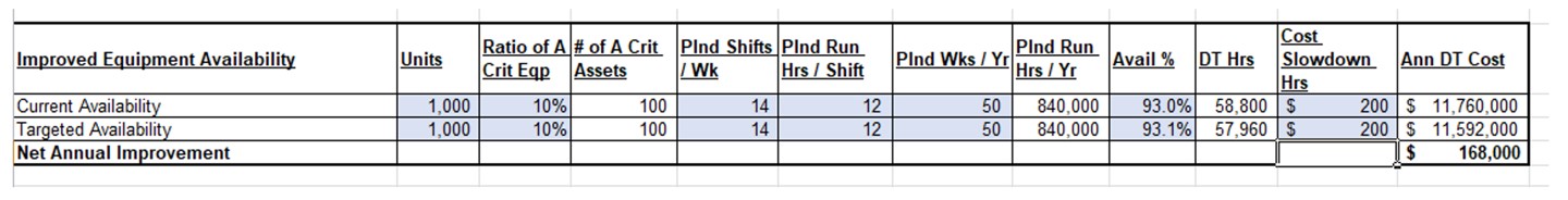 - Assuming implementing an onsite oil analysis program improves the availability by 0.1% (from 93% to 93.1%).