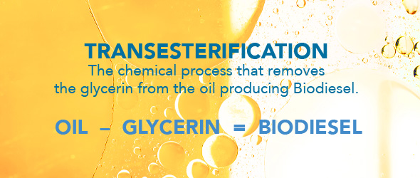 Biodiesel can be used in any concentration with petroleum based diesel fuel in existing diesel engines with little or no modification. Biodiesel is not the same thing as raw vegetable oil. A chemical process that removes the glycerin from the oil produces Biodiesel. This chemical process is called transesterification, whereby the glycerin is separated from the fat or vegetable oil. The process leaves behind two products -- methyl esters (the chemical name for biodiesel) and glycerin (a valuable byproduct usually sold to be used in soaps and other products).