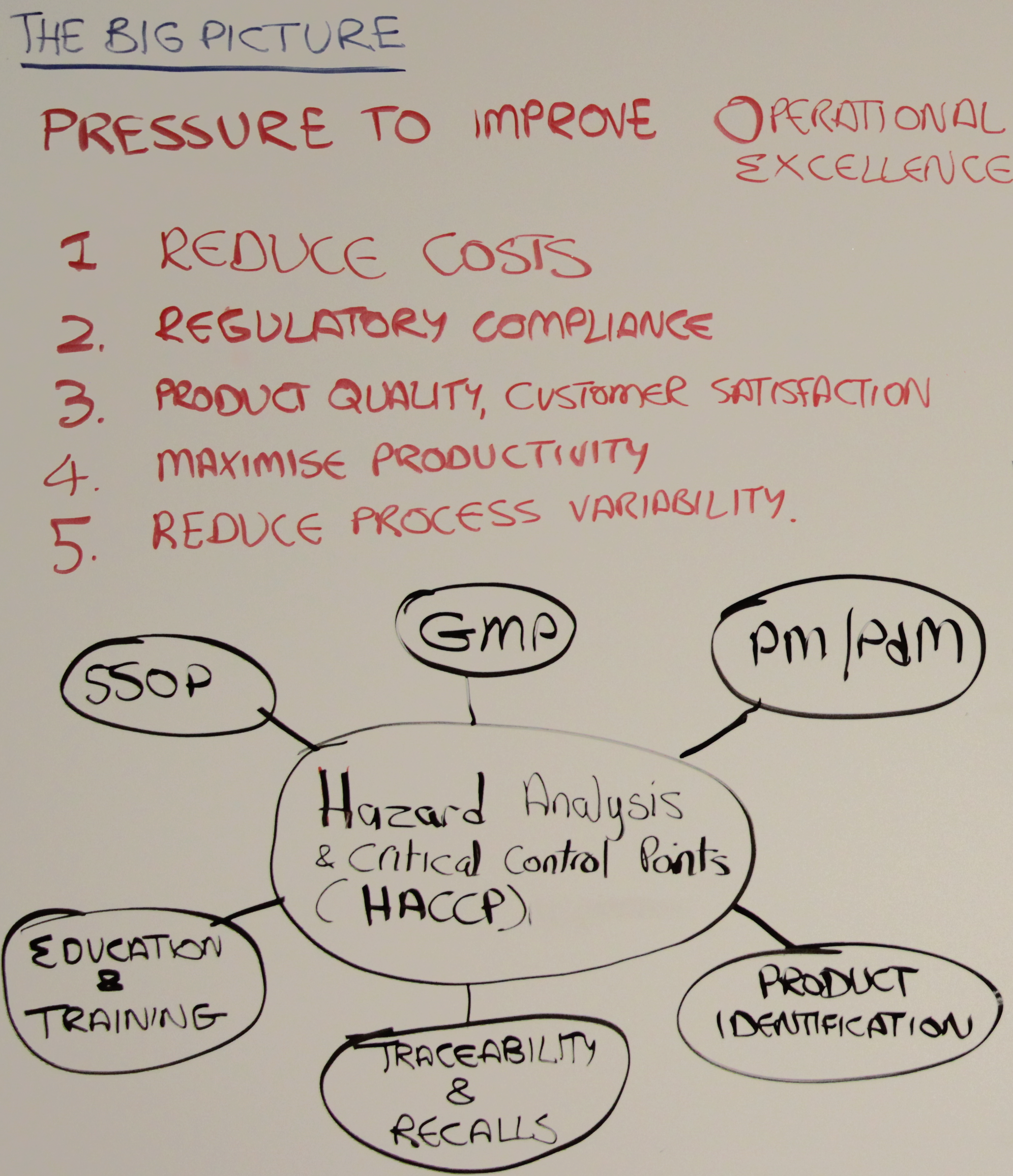 Almost all food and beverage industries have to have some form of a voluntary plan for controlling the process. This voluntary plan is known as their "hazard analysis and critical control points" plan, also known as HACCP. There are six major components to the HACCP. There's the sanitary standard operating procedures (SSOP), good manufacturing practices, education and training, traceability and recalls, product identification, and preventive maintenance. Even though the plans are voluntary, the Food Safety Modernization Act of 2011 enforces them in the US. Many other countries are following suite, and now companies that violate these terms are subject to enforcement penalties. One of the biggest factors in food and beverage companies is disruption avoidance. Maintaining up time is crucial because they need to keep the production up and running. With production being the most crucial component, contamination control is next on the list.
