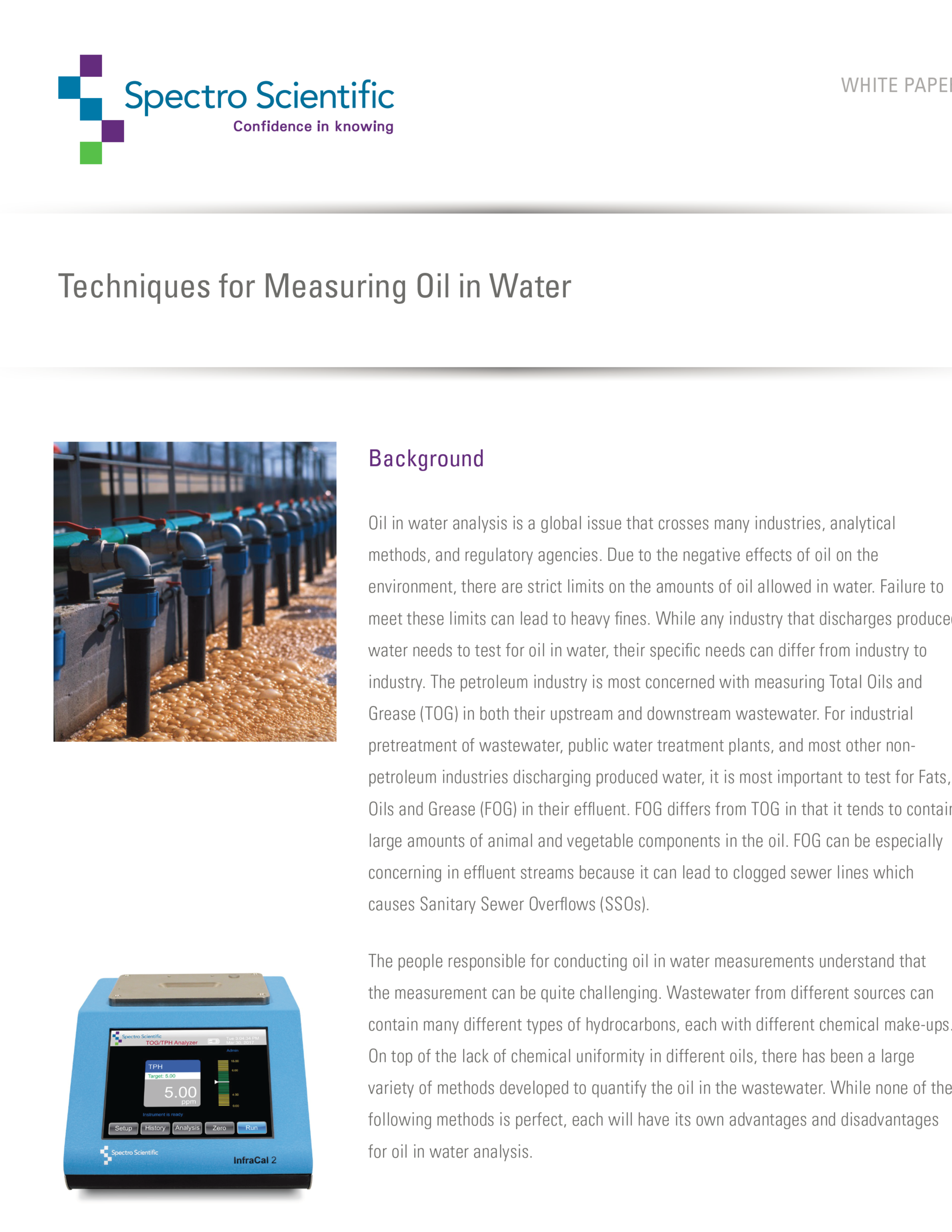 The people responsible for conducting oil in water measurements understand that the measurement can be quite challenging. Wastewater from different sources can contain many different types of hydrocarbons, each with different chemical make-ups. On top of the lack of chemical uniformity in different oils, there has been a large variety of methods developed to quantify the oil in the wastewater. While none of the following methods is perfect, each will have its own advantages and disadvantages for oil in water analysis.Oil in water analysis is a global issue that crosses many industries, analytical methods, and regulatory agencies. Due to the negative effects of oil on the environment, there are strict limits on the amounts of oil allowed in water. Failure to meet these limits can lead to heavy fines. While any industry that discharges produced water needs to test for oil in water, their specific needs can differ from industry to industry. The petroleum industry is most concerned with measuring Total Oils and Grease (TOG) in both their upstream and downstream wastewater. For industrial pretreatment of wastewater, public water treatment plants, and most other nonpetroleum industries discharging produced water, it is most important to test for Fats, Oils and Grease (FOG) in their effluent. FOG differs from TOG in that it tends to contain large amounts of animal and vegetable components in the oil. FOG can be especially concerning in effluent streams because it can lead to clogged sewer lines which causes Sanitary Sewer Overflows (SSOs).
