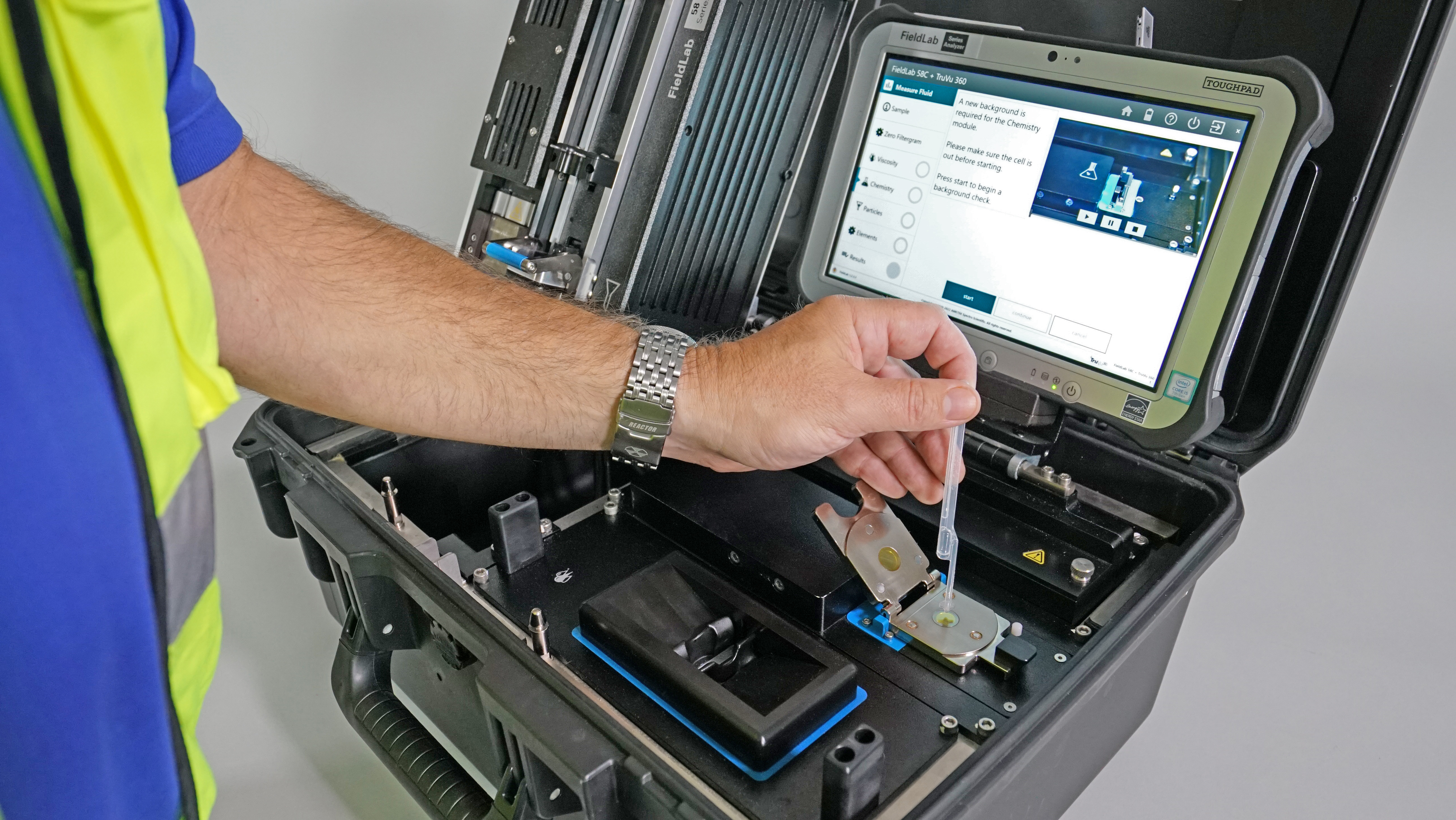 - Infrared spectrometer with flip top cell design; tests for Total Acid Number/Total Base Number, water content, soot, oxidation and new fluid validation.