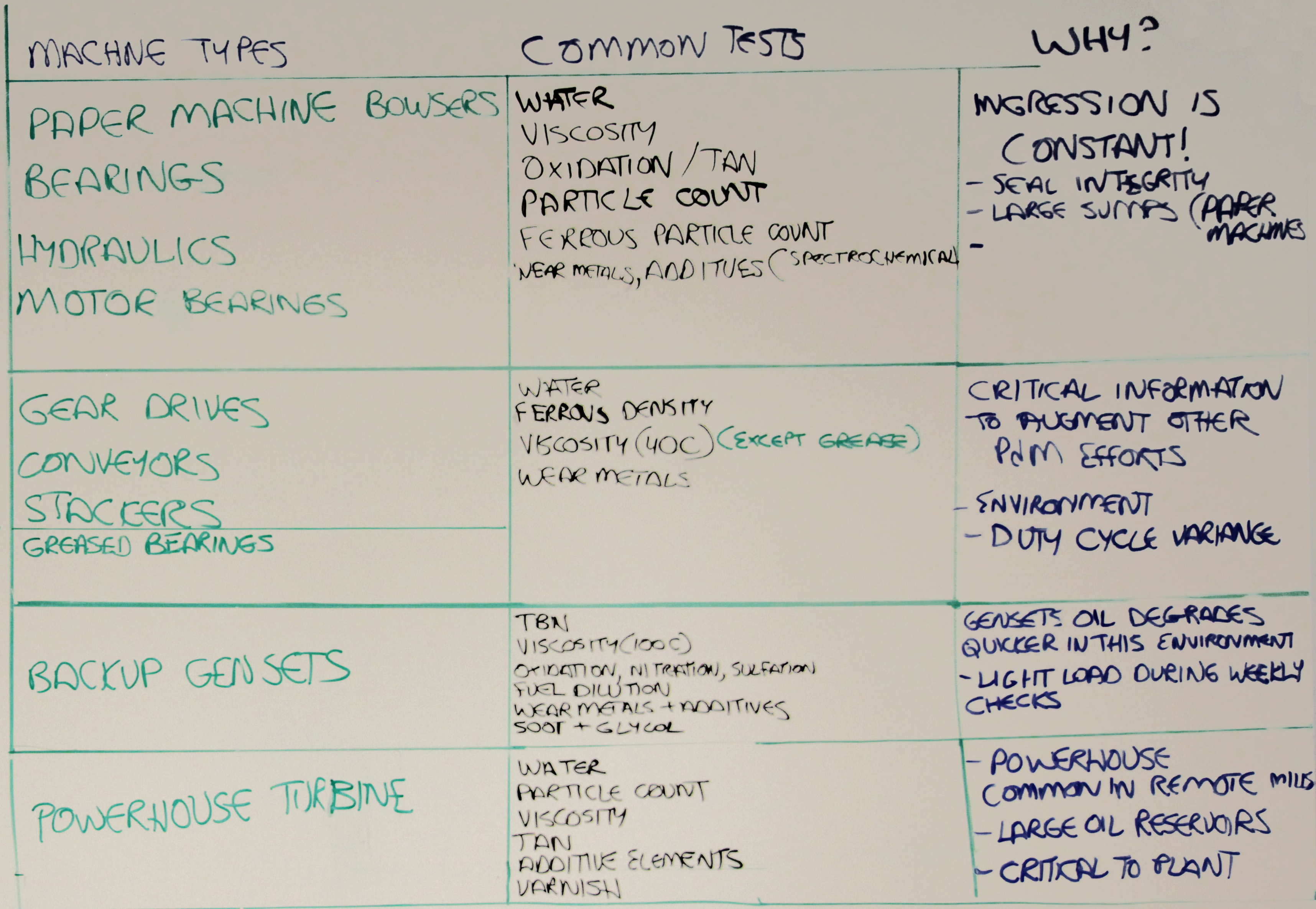 The main paper machine is a system of rollers, motors, and drives, so paper machine bowsers, bearings, hydraulics, and motor bearings should all be considered for oil analysis. These machines generally run clean, so one of the big issues is water ingression, due to the wet and humid environment of the paper mill. Viscosity, oxidation and acidity are important because they indicate and affect the potential for corrosion and film strength. Particle count is an important parameter due to the tight clearances in several of these valve filtration systems. Similarly, ferrous particle count can catch any possible wear, especially on geared systems at the back end of the machine. These machines require consistent monitoring, and most mills perform monthly testing. Water ingression needs constant monitoring since paper mills operate 24/7, and seal integrity is always changing. Some mills are located in remote areas with very hot summers followed by very cold winters. These conditions affect the way the machines operate and they can cause equipment issues if not properly maintained.