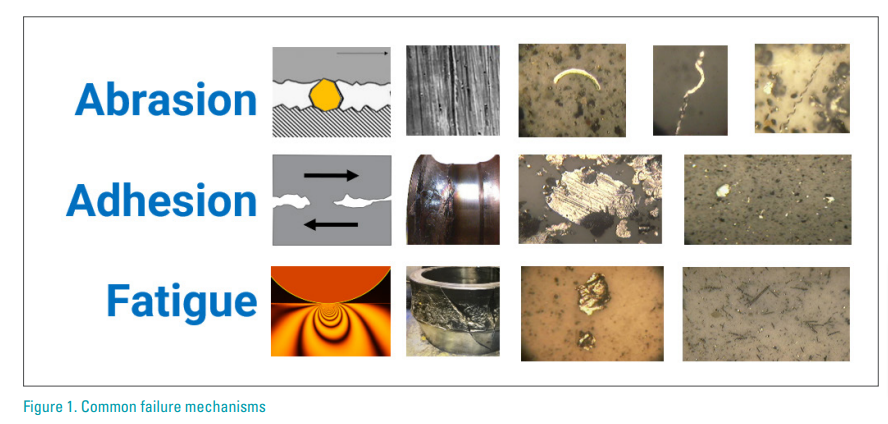 Figure 1 depicts the mechanics for abrasion, adhesion, and fatigue mechanisms, presents extensively damaged example components, and presents images of large wear particles from each respective mechanism.