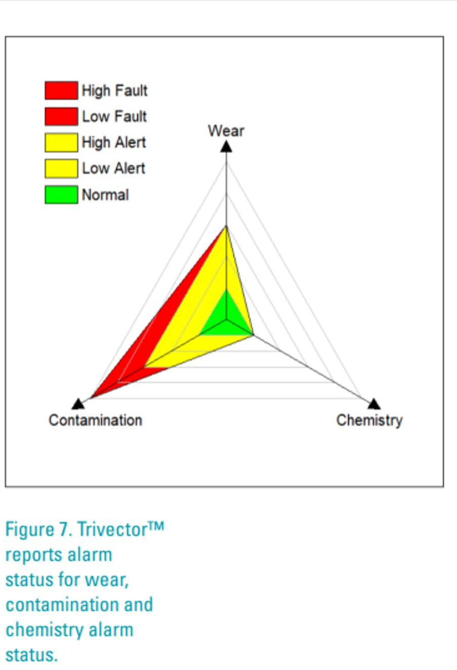 Comprehensive oil analysis requires sampling, testing and analyzing in-service industrial lubricants to evaluate the wear condition of machinery, the contamination condition of lubrication systems, and chemistry condition of the lubricants. Figure 7 graphically represents overall findings for predictive component wear condition, for proactive contamination condition and for proactive fluid chemistry condition.