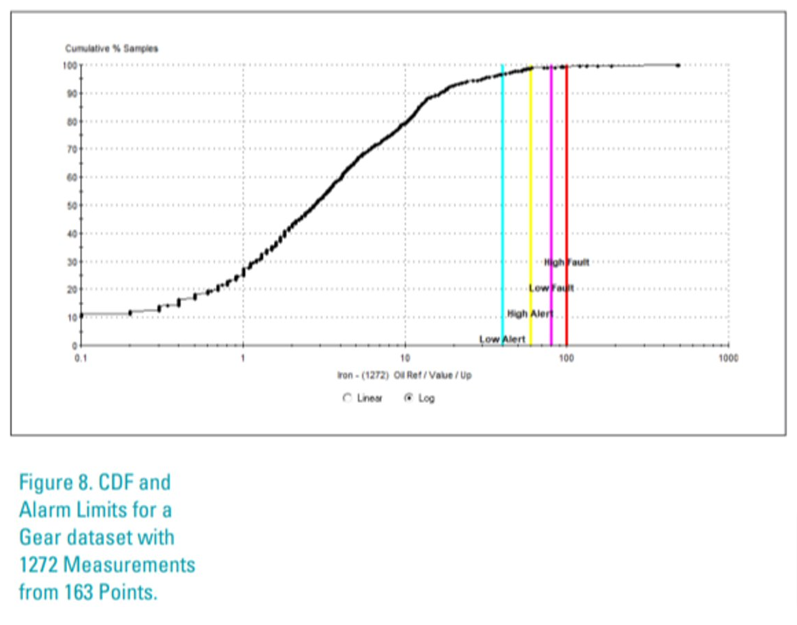 The following Figure 8 presents a CDF and alarm limits for Fe PPM measured using rotating disc spectroscopy