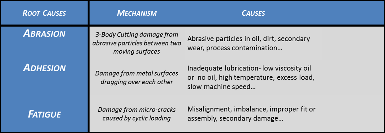 Abrasion, fatigue, and adhesion are the most common wear mechanisms. While some amount of wear is to be expected, extreme degradation that causes a machine to be removed from service is not normal. The good news is that most types of wear can be controlled, even prevented, with proper maintenance and care.