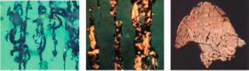 In addition, two types of particles are associated with rolling mechanisms. These are fatigue chunks and laminar particles. Fatigue chunks represent material removed as rolling elements spall. Laminar particles, which are large, thin plates, result from material being passed through the rolling contact. Combined rolling and sliding, as in gears, produces scuffing particles and fatigue chunks. Determination of the composition of particles can establish their origin. The site of deposition, reflectivity, and color of particles aid in their identification. Figure 2 shows examples of abrasive wear, sliding wear and fatigue wear.
