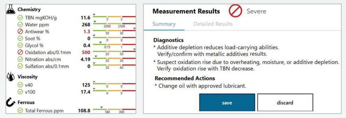 The oil condition parameters measured by FluidScan include oxidation, nitration, sulfation, anti-wear additive, Total Base Number (TBN), glycol, soot, and water for engine oil; and oxidation, Total Acid Number (TAN), and water for rotating machine lubricants such as gear oil, transmission oil and hydraulic oil.