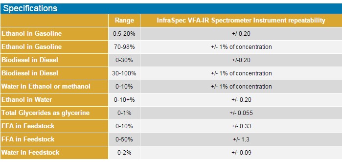 The InfraSpec VFA-IR Spectrometer is a portable infrared analyzer that provides on-site analysis of biodiesel in diesel, ethanol in gasoline and water in ethanol, all in less than a minute. Weighing less than 5 lbs. including the rechargeable battery, the system may be on the move for a full shift before requiring a recharge. The InfraSpec VFA-IR is highly reliable and simple to operate, making it ideal where a single, repetitive percent biodiesel in diesel test is needed.